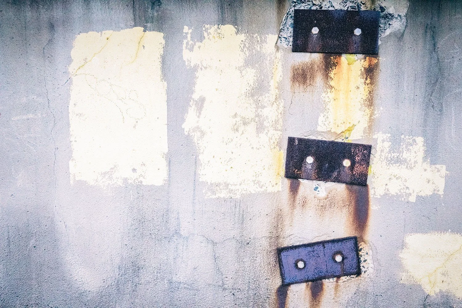 Rusted bracing on the old coal bunker concrete wall juxtaposed with horizontal blotches of pale yellow form a rather abstract work of art.
